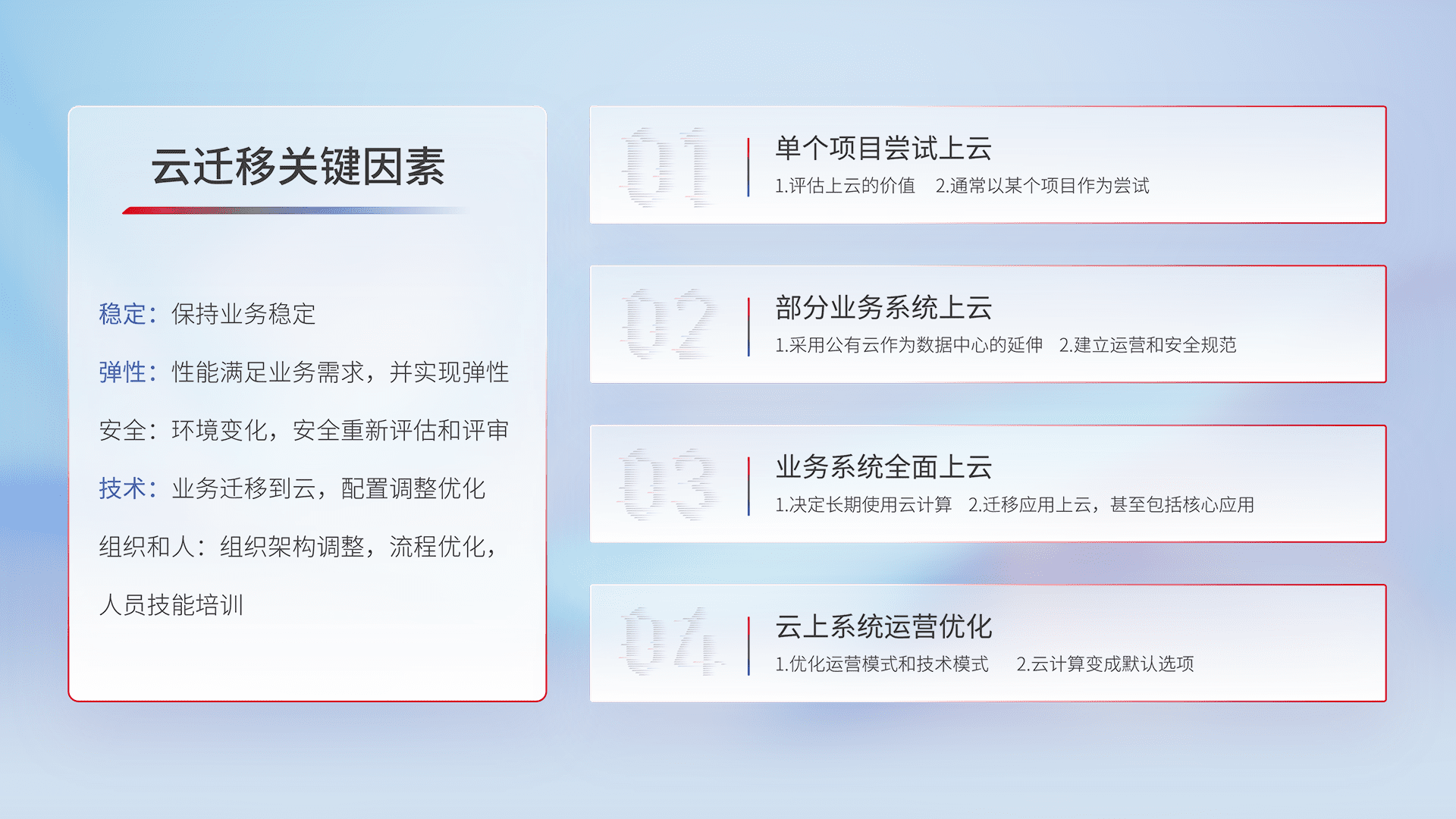 结合实际业务,,,,从规划设计、、、、云平台选型、、、云原生改造、、数据迁移、、、集成交付,,,迁移全过程为客户识别最佳上云路径,,做好风险识别管理,,,设计网络架构、、身份权限、、、安全审计合规、、、操作审计、、日志审计、、、、监控告警策略、、多站点容灾设计等,,对云上基础设施进行整体规划,,提升IT治理水平,,,以满足弹性、、、、高可用、、、高性能的需求。。