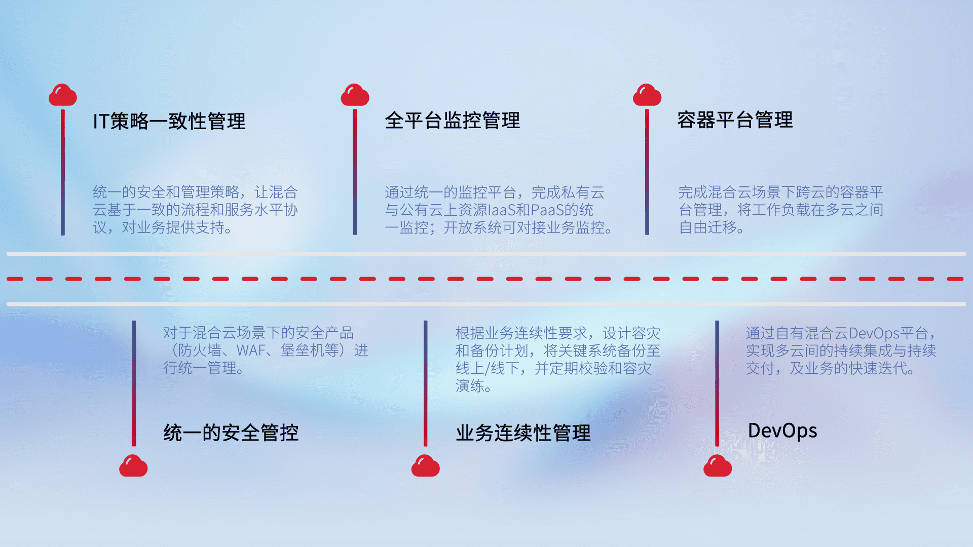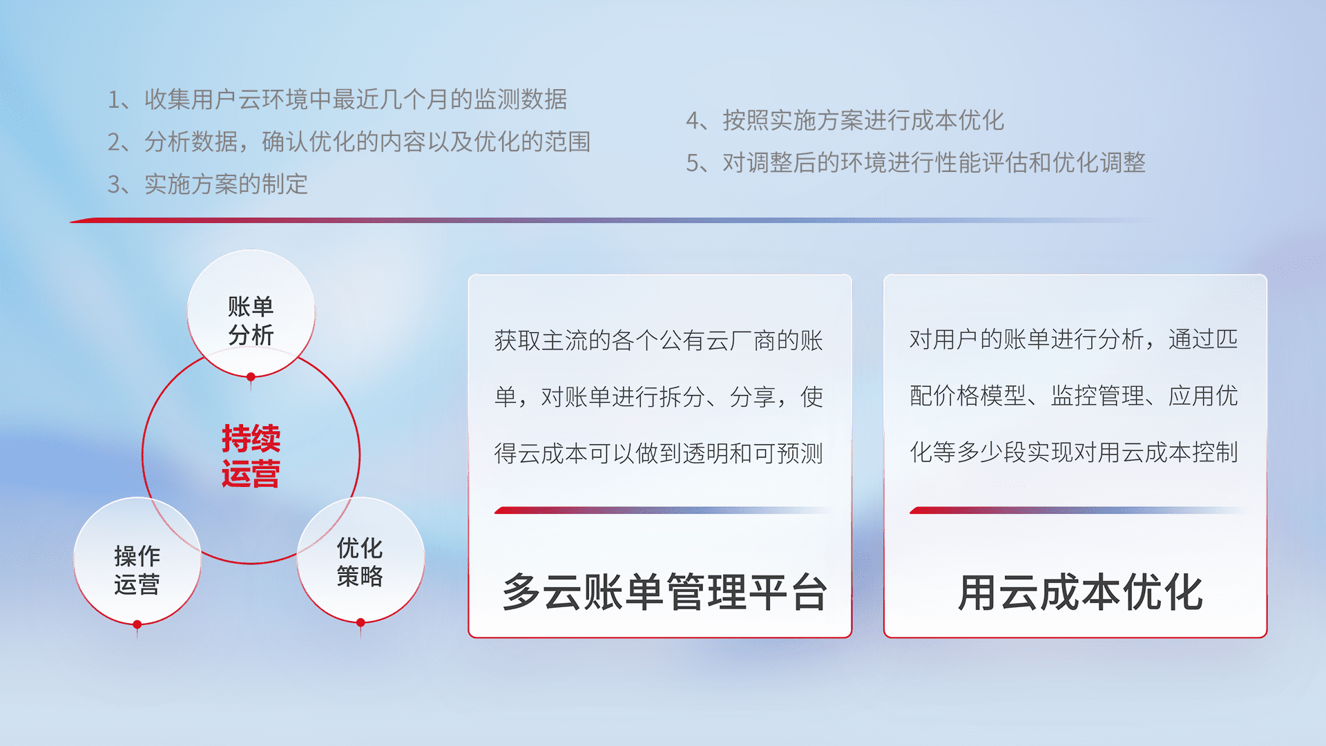 通过多云纳管,,以统一的资源数据模型把客户的云资源进行抽象和封装,,,,进而实现对多云资源的统一操作,,保障云资源管理的可靠性、、稳定性与可用性。。。。量身定制化运维内容,,,,配置、、、、开发运维、、补丁管理、、、备份、、、监控、、认证和访问管理、、、审计和日常巡检等,,保障在用云过程中的可靠度,,稳定度以及高可用率。。