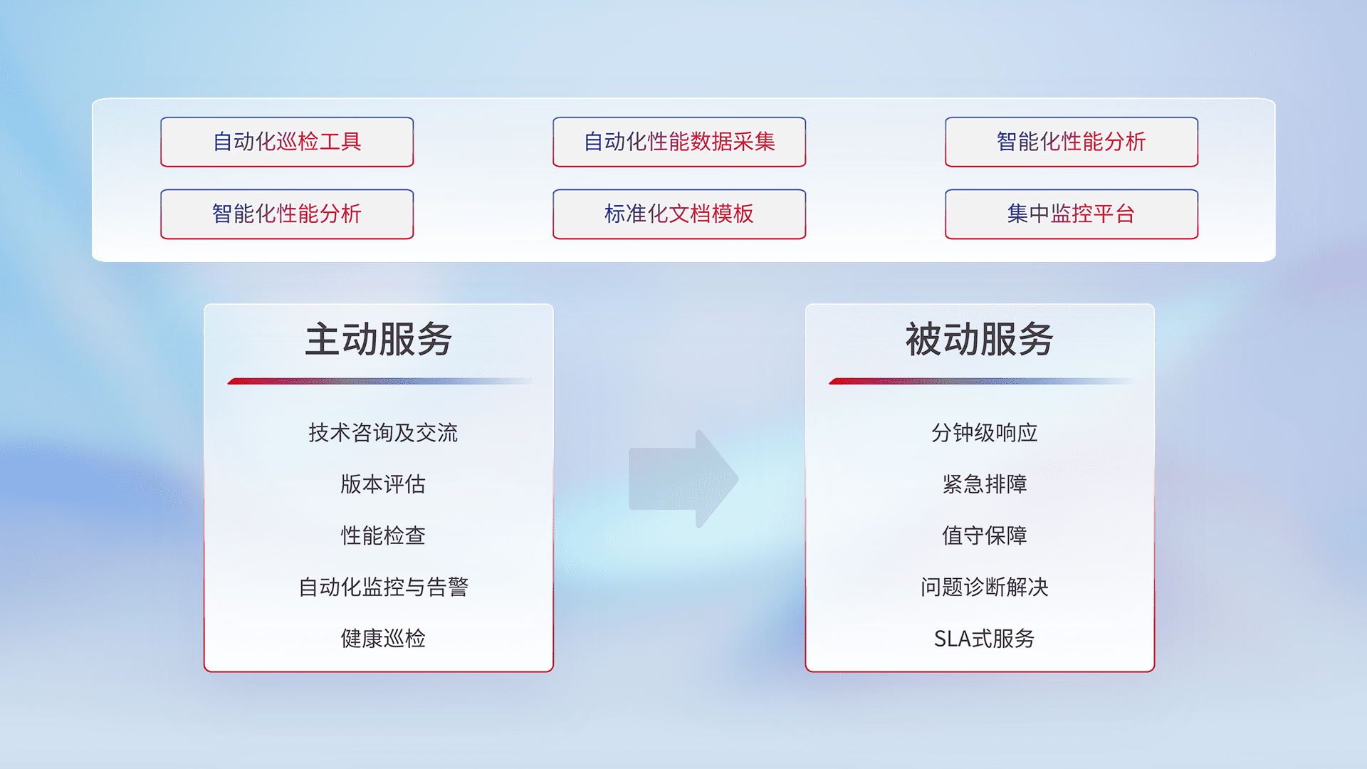 智能化工具和标准化文档,,,,保障服务质量,,,,提供主动服务(包含技术咨询、、、、版本评估、、、性能检查、、、自动化监控与告警、、健康巡检)和被动服务包含(分钟级响应、、、紧急排障、、、值守保障、、、、问题诊断解决、、SLA服务)。。